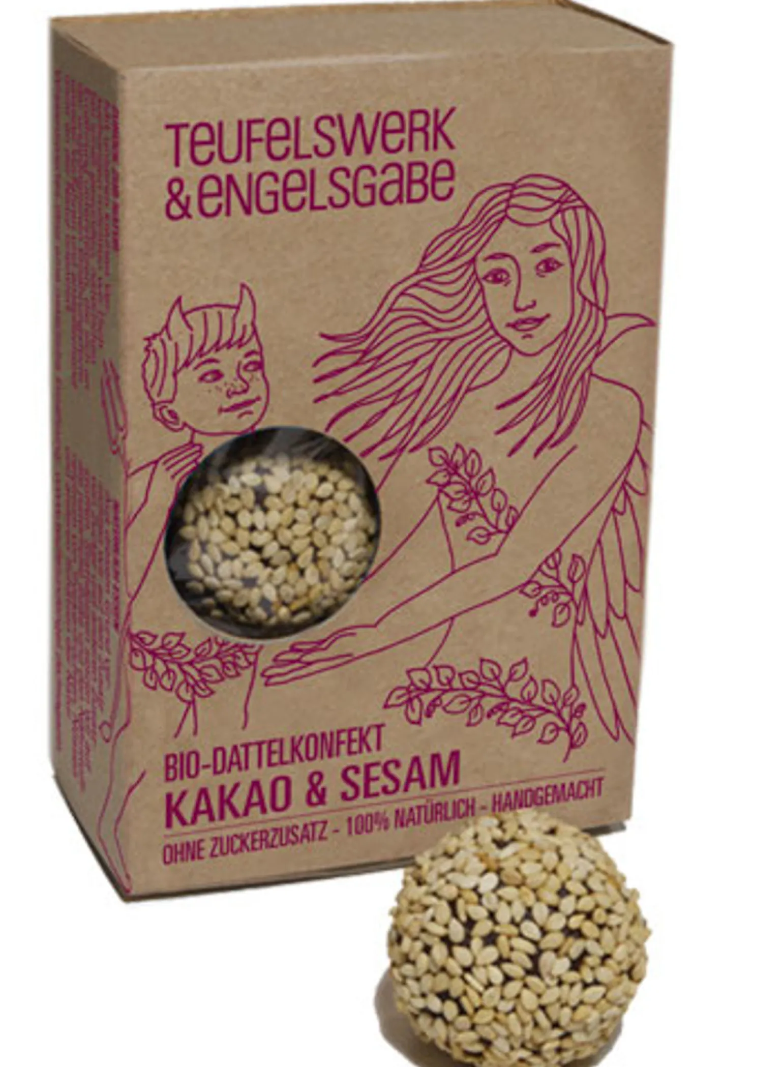 Diese Variante des fruchtig leckeren Dattelkonfekts von Teufelswerk & Engelsgabe ist mit aromatischem Kakao verfeinert. Außen trägt dieser gesunde Snack eine Hülle aus gerösteten Sesamsamen.