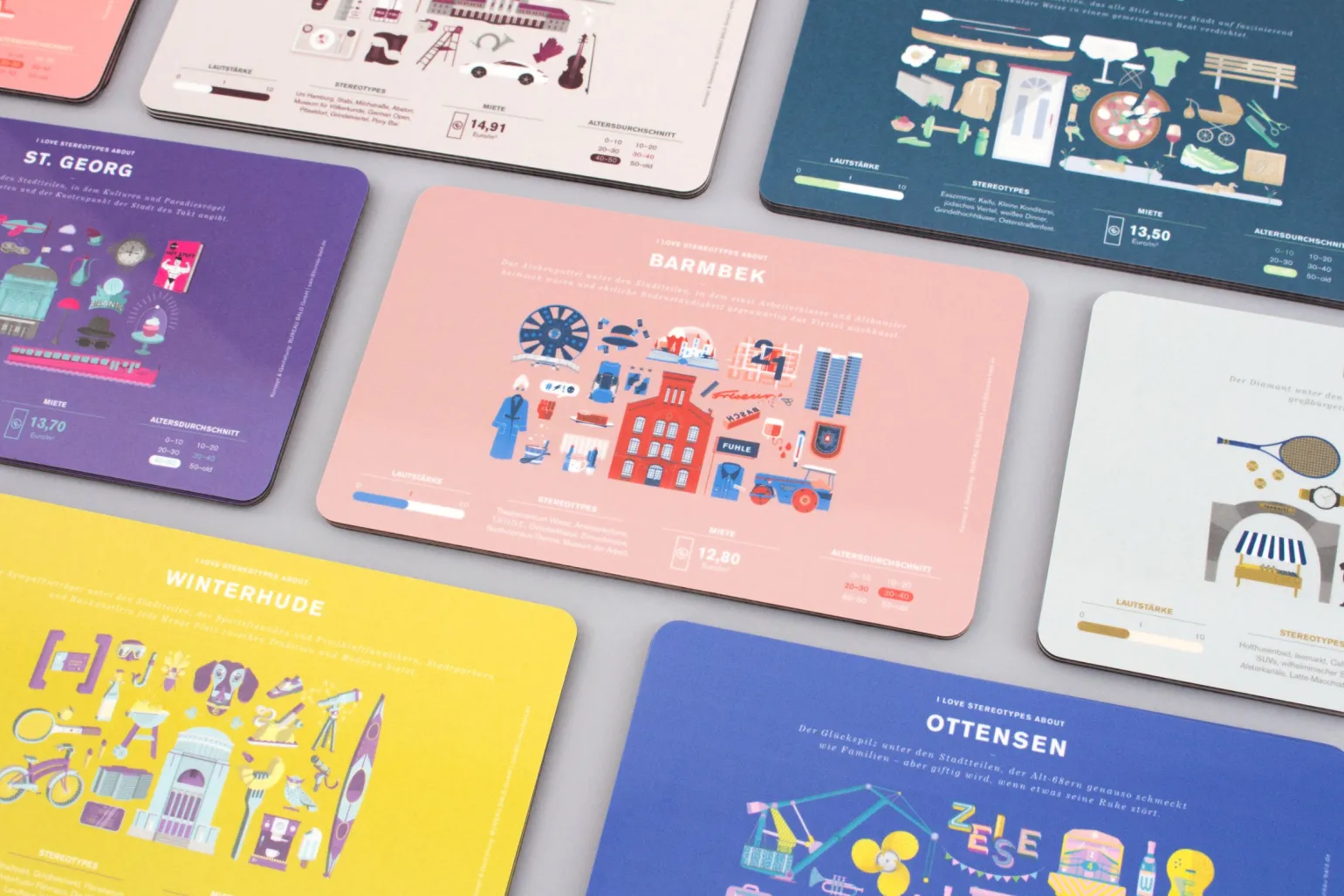 Schön zu wissen: Diverse Fakten und Stereotypes über den Hamburger Stadtteil St. Georg und seine Bewohner verzieren dieses bunte Frühstücksbrettchen.